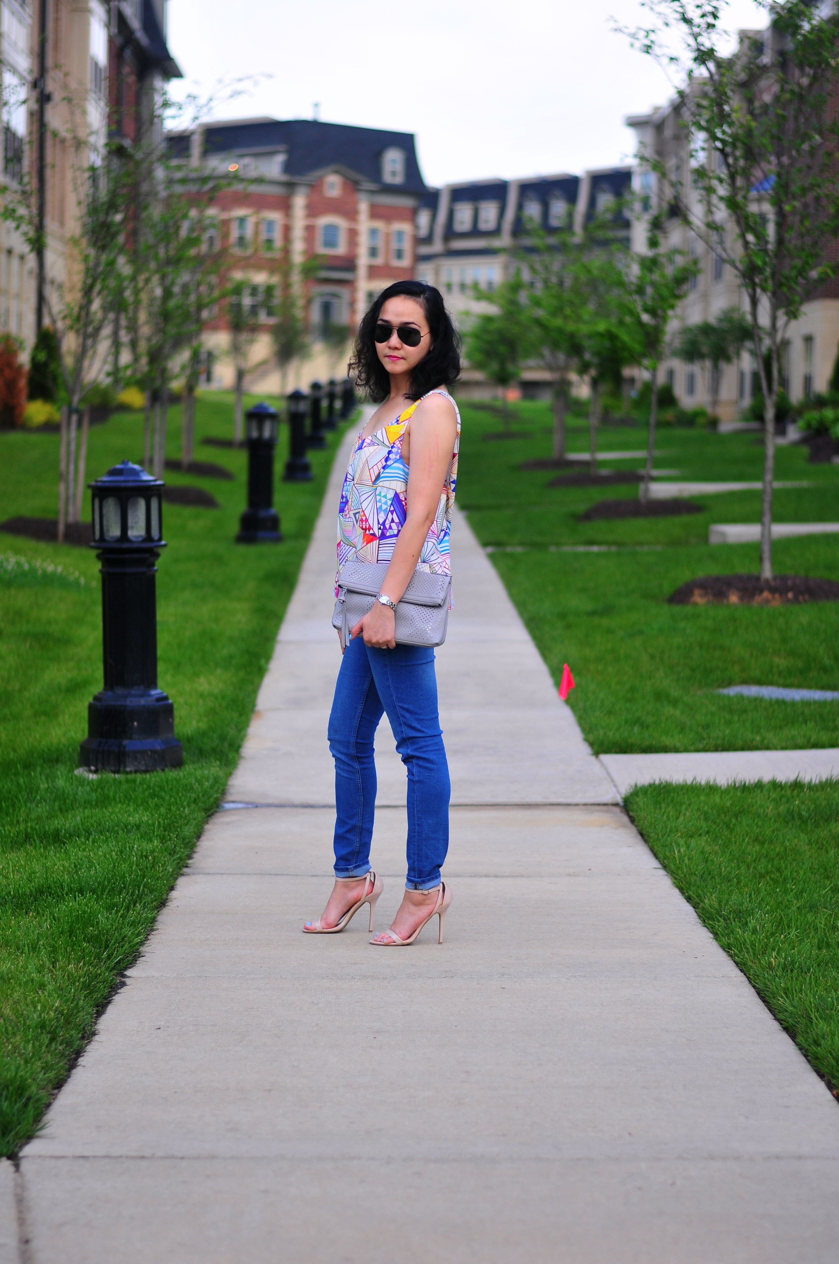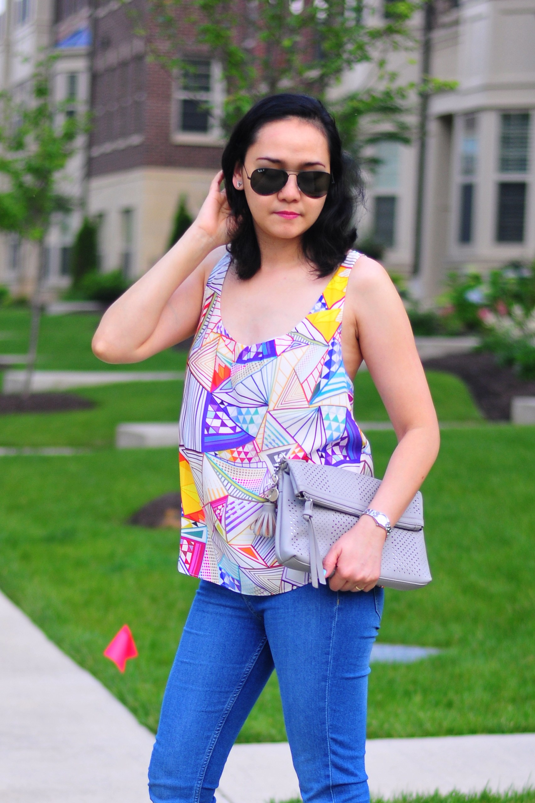 For look 2: I chose this tank top because I really enjoyed looking at those pretty prints. It is just so classy and it makes me smile just by looking at it, I don’t know why. I just wore a pair of jeans and my ankle strap heels to make it more sophisticated even with jeans and added the gray clutch. Just a simply chic casual style. Which I know everybody can pull off.