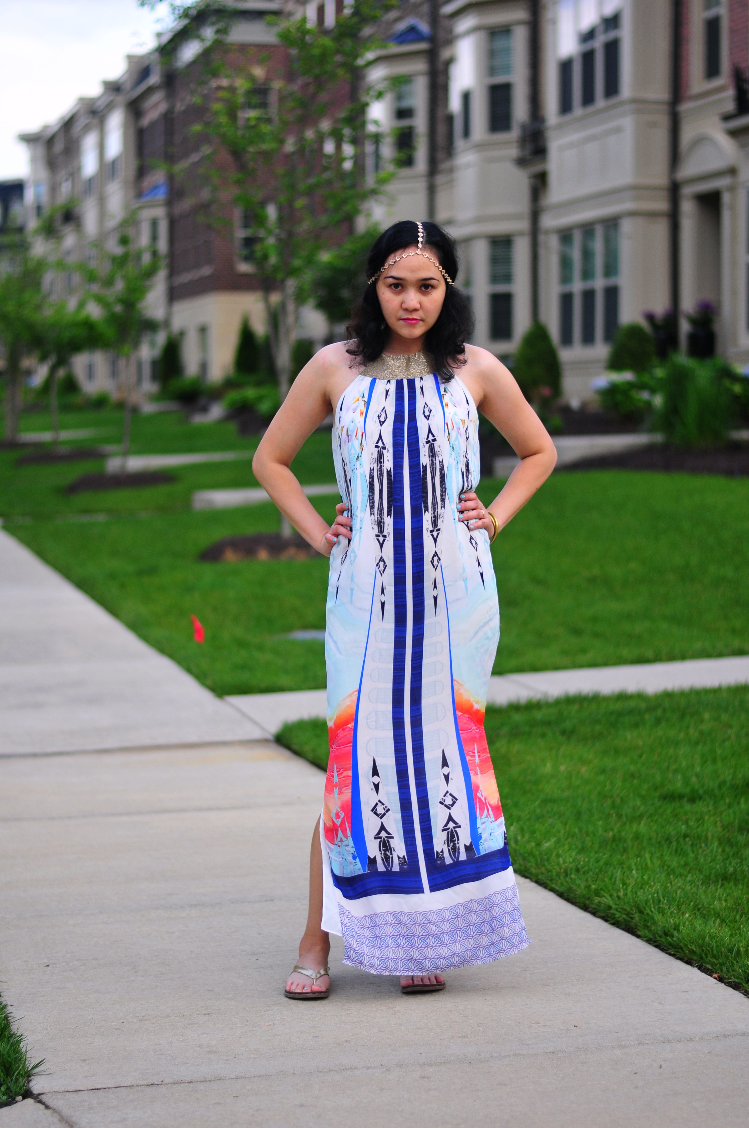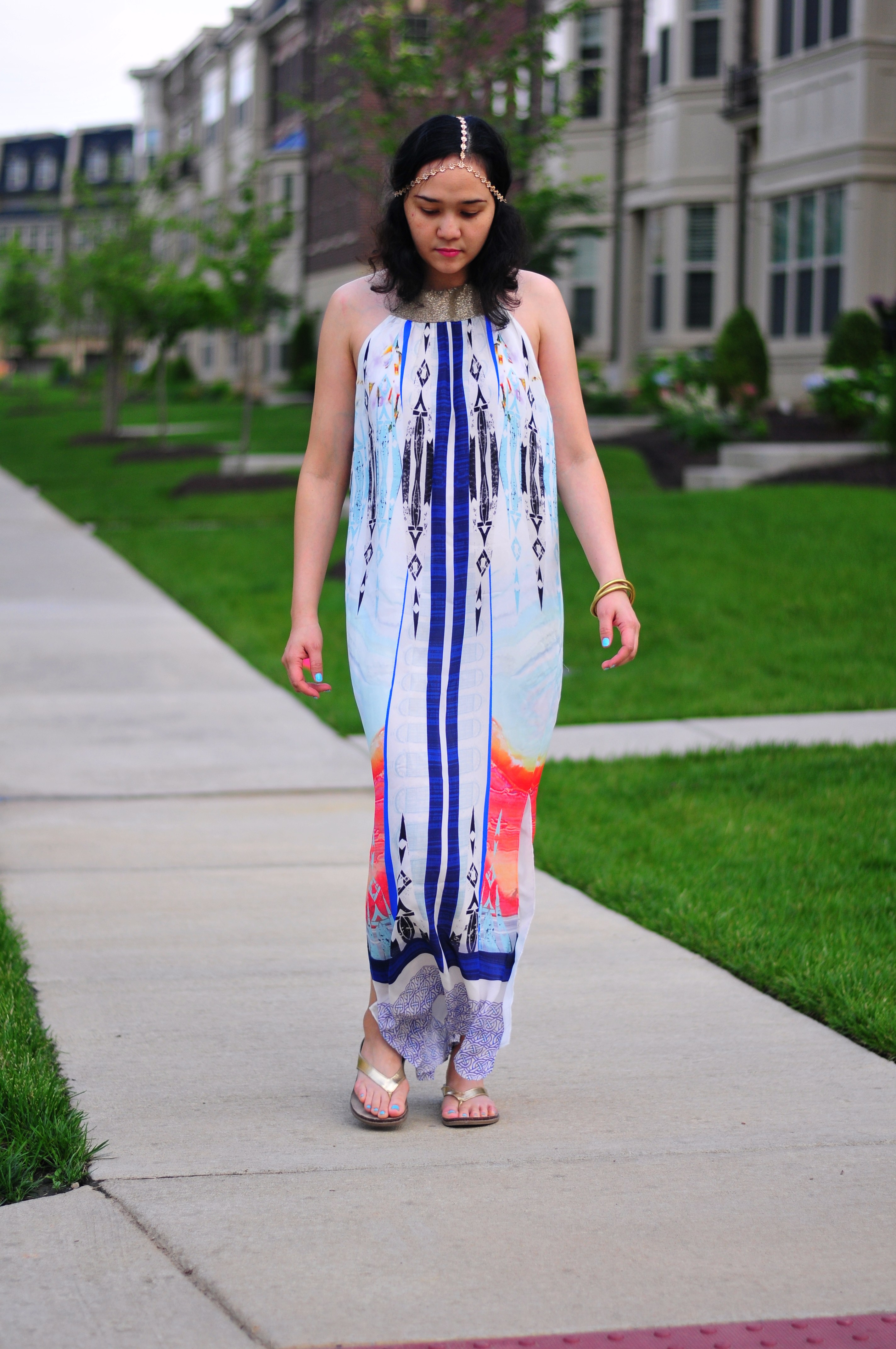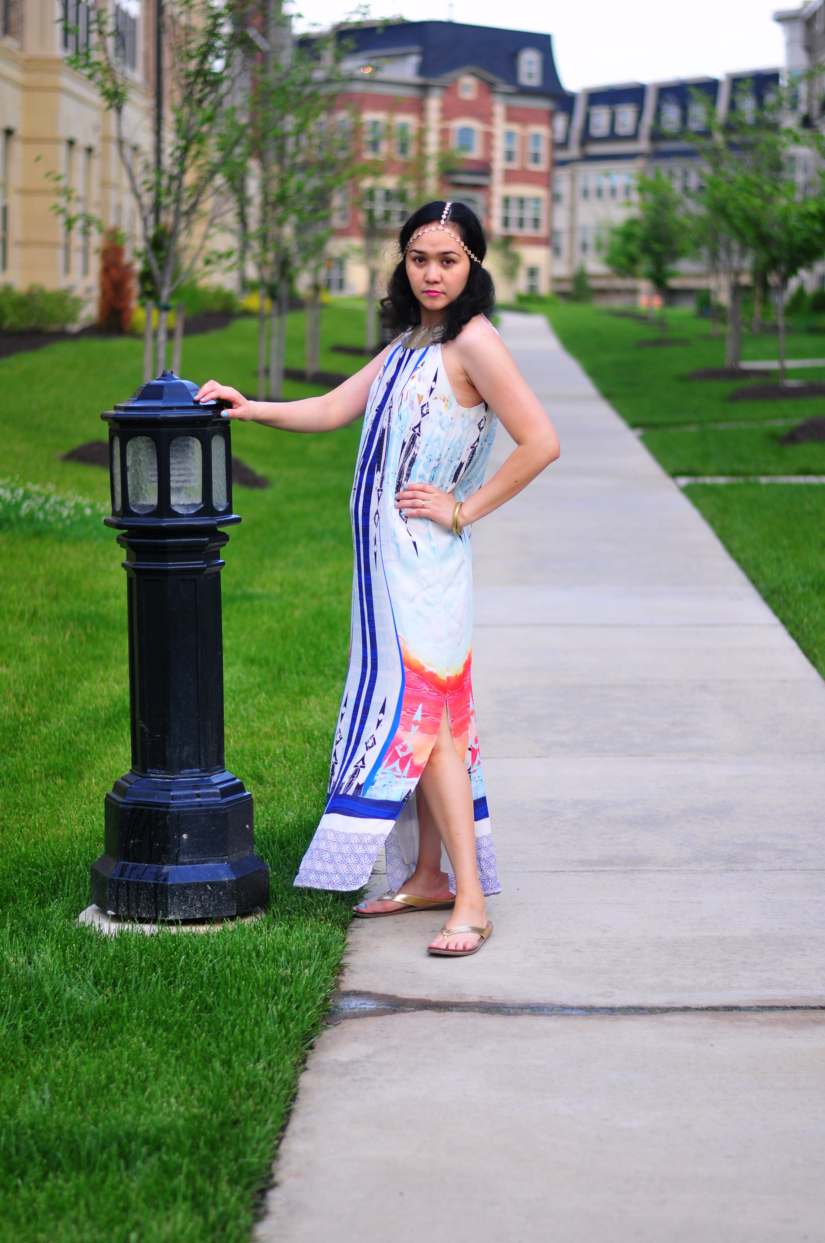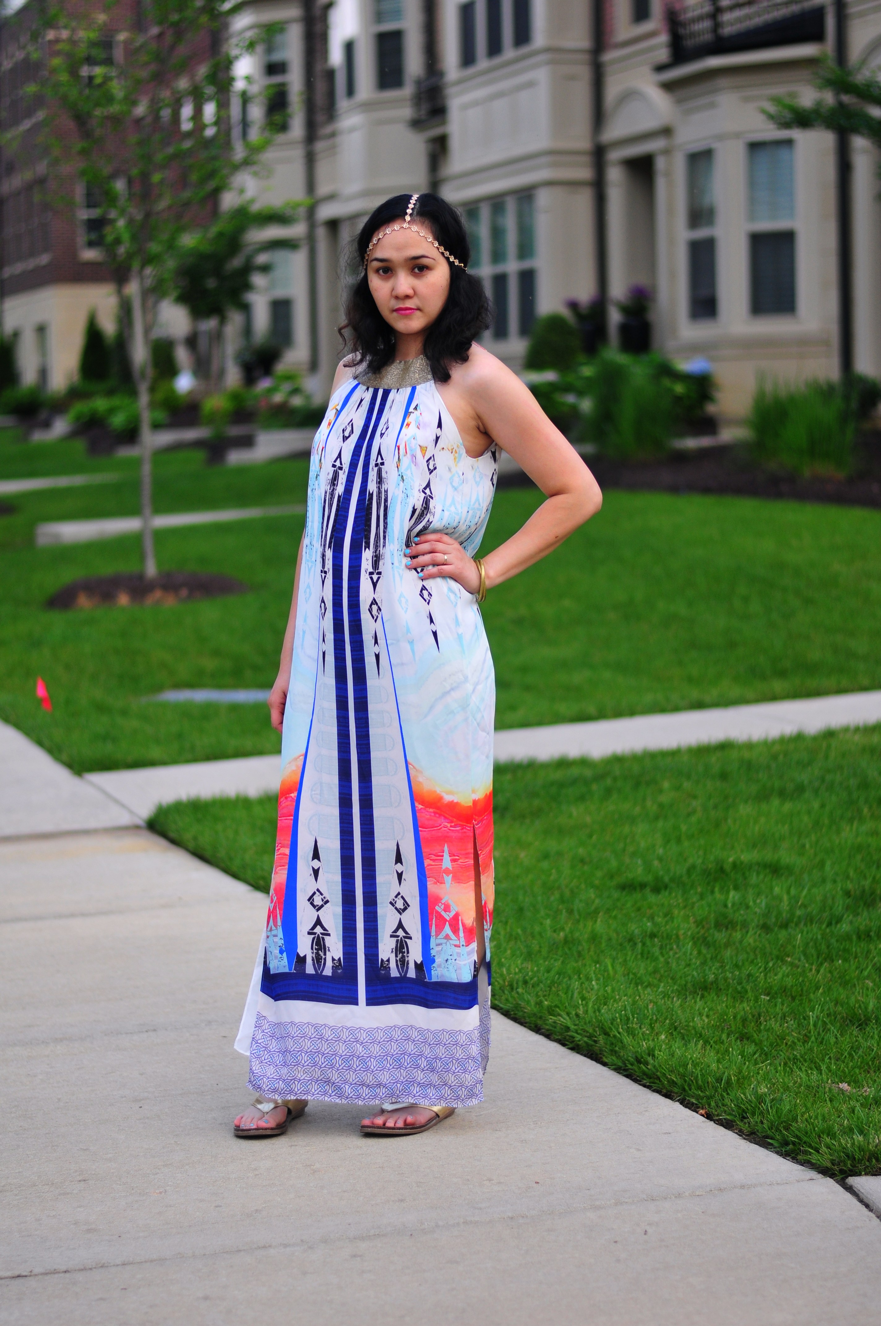 I chose this dress because I love wearing maxi’s this summer. The bead work around the neck also got me. It is so detailed and when I was looking at it, I already knew what I would want to use as my accessories. I wore the gold headpiece I got from headbandsforhope. Another brand that also supports a cause (they give a headband to a cancer patient for every headband sold). I was thinking of a Greek Goddess look as I always feel in my mind that Greece has forever summer. I also wore this gold slippers I had and added gold bracelets. If I can just change the my location to Greece, the background would even be more perfect.